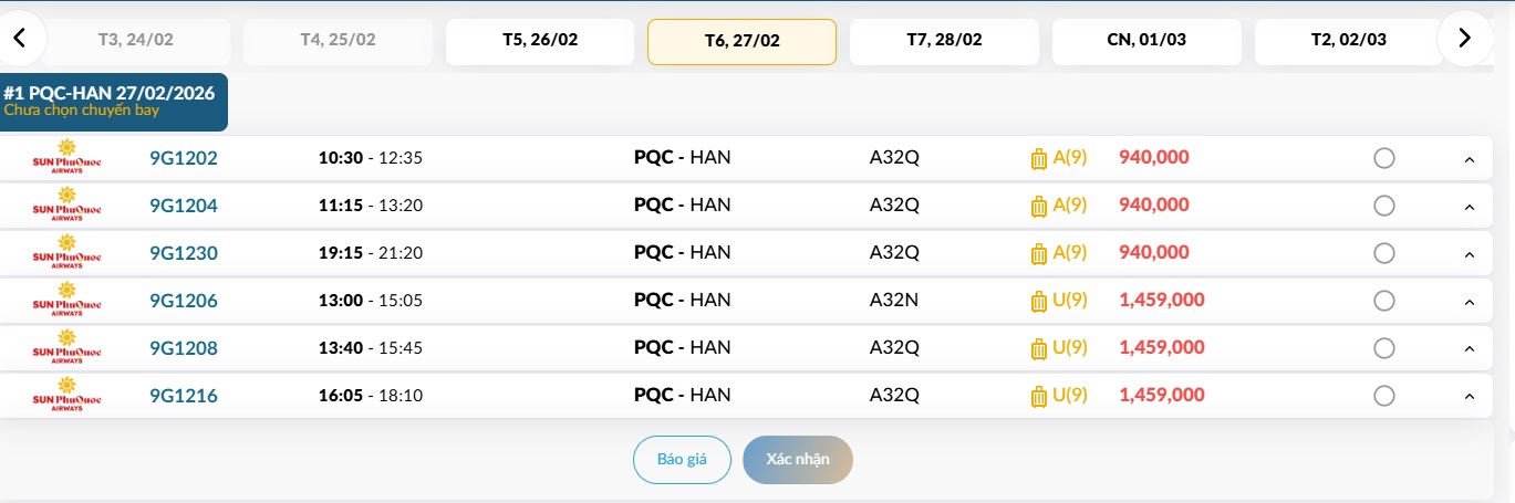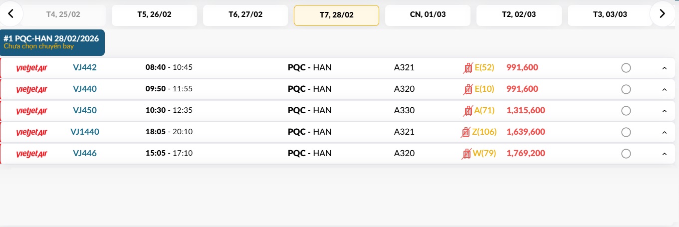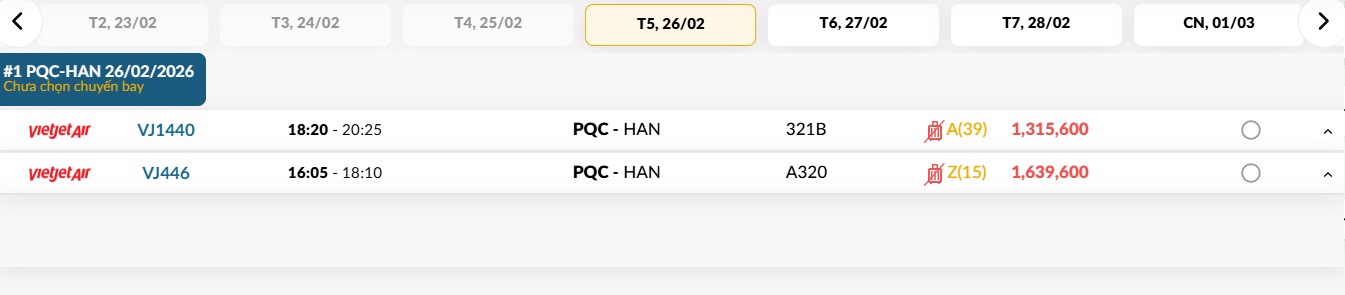 Phú Quốc (PQC) - Hà Nội (HAN) Thứ năm 26/02/2026