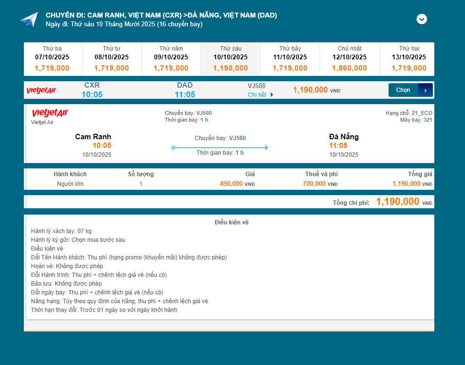 Cam Ranh (CXR) - Đà Nẵng (DAD) 10/10/2025
