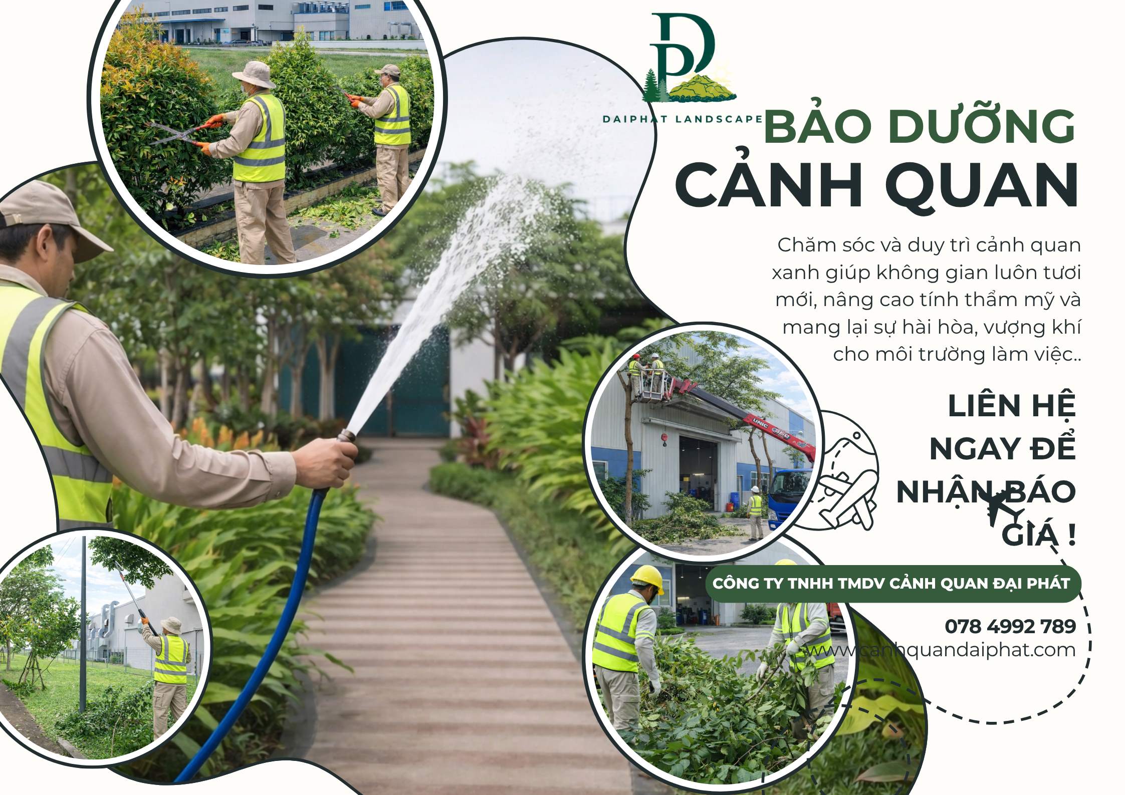 👉 Cảnh Quan Đại Phát cung cấp dịch vụ chăm sóc cây xanh & vệ sinh cảnh quan định kỳ, phù hợp tiêu chuẩn KCN Nhơn Trạch!