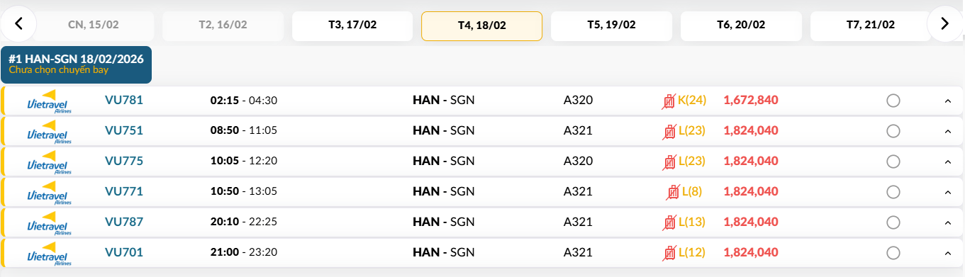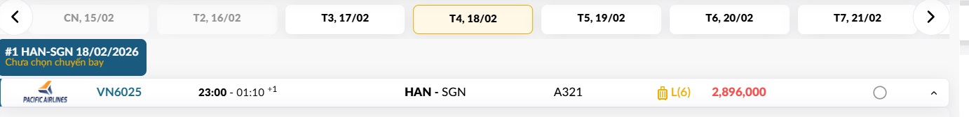Hà Nội - TP. Hồ Chí Minh (SGN) Thứ tư 18/02/2026 Mồng 2 têt