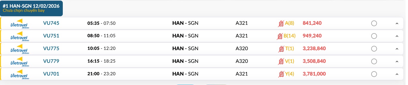 Hãng Vietnam Airlines VN8003 Bay thẳng Hạng S 2,051,000 VNĐ 110/15/23 Bà Hom Phường 14...