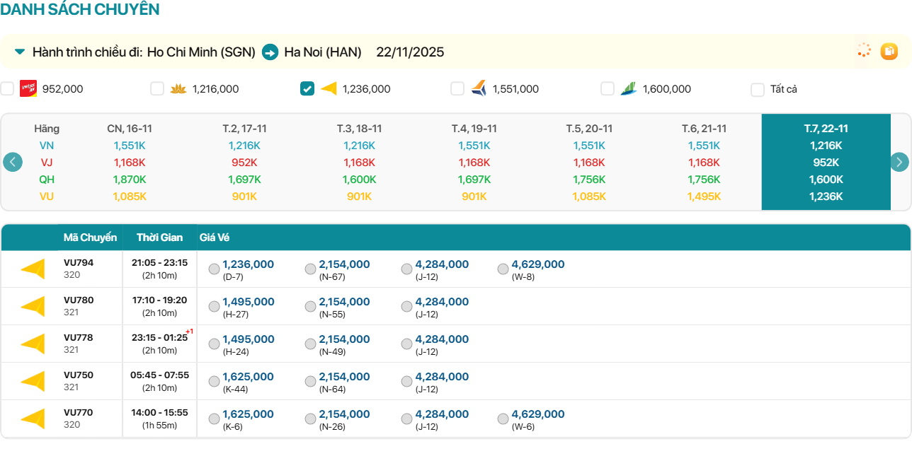 VJ132 09:00-11:10 vé máy bay 1,168,000 -