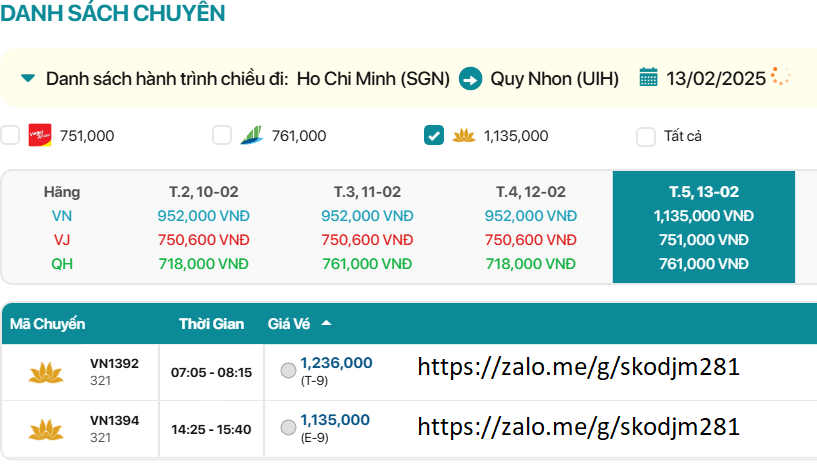 Hãng Vietnam Airline VN1392 Bay thẳng Hạng T 07:05-08:15 vé máy bay 1,236,000