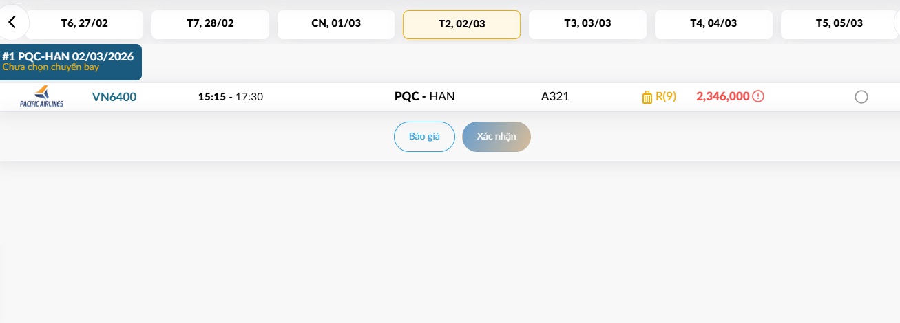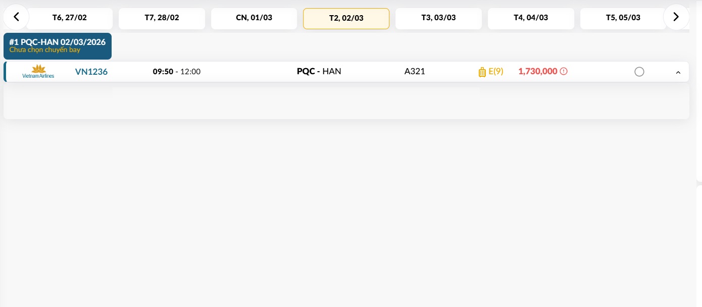 Phú Quốc (PQC) - Hà Nội (HAN) Thứ bảy 02/03/2026