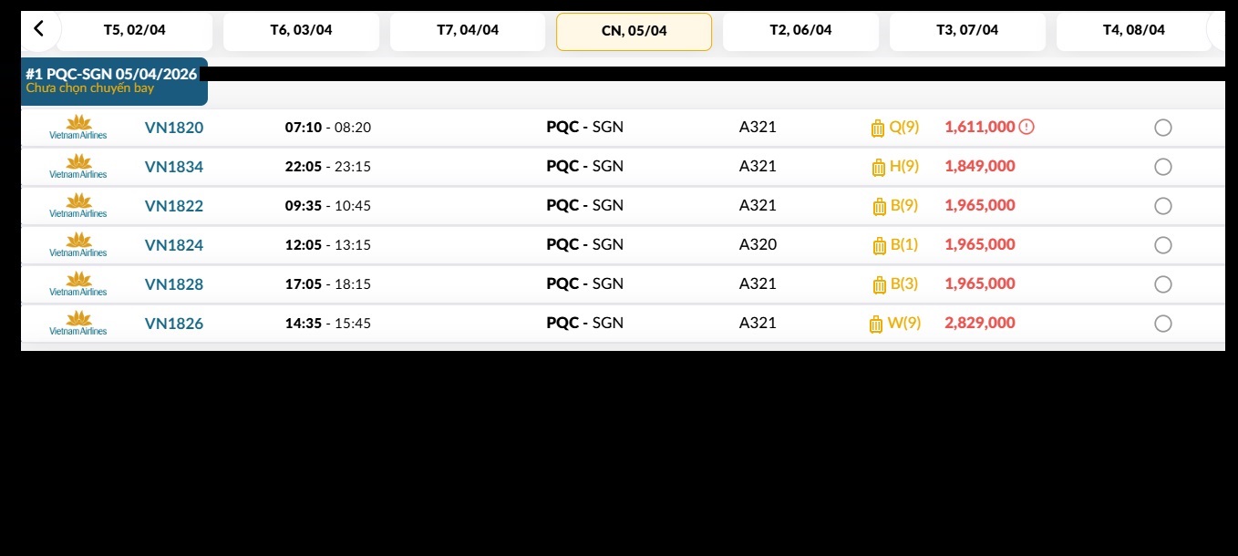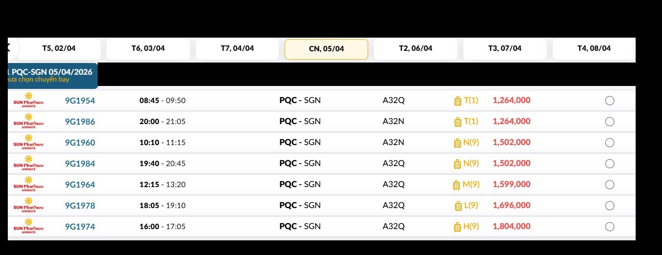 Phú Quốc (PQC) - TP. Hồ Chí Minh (SGN) Chủ nhật 05/04/2026