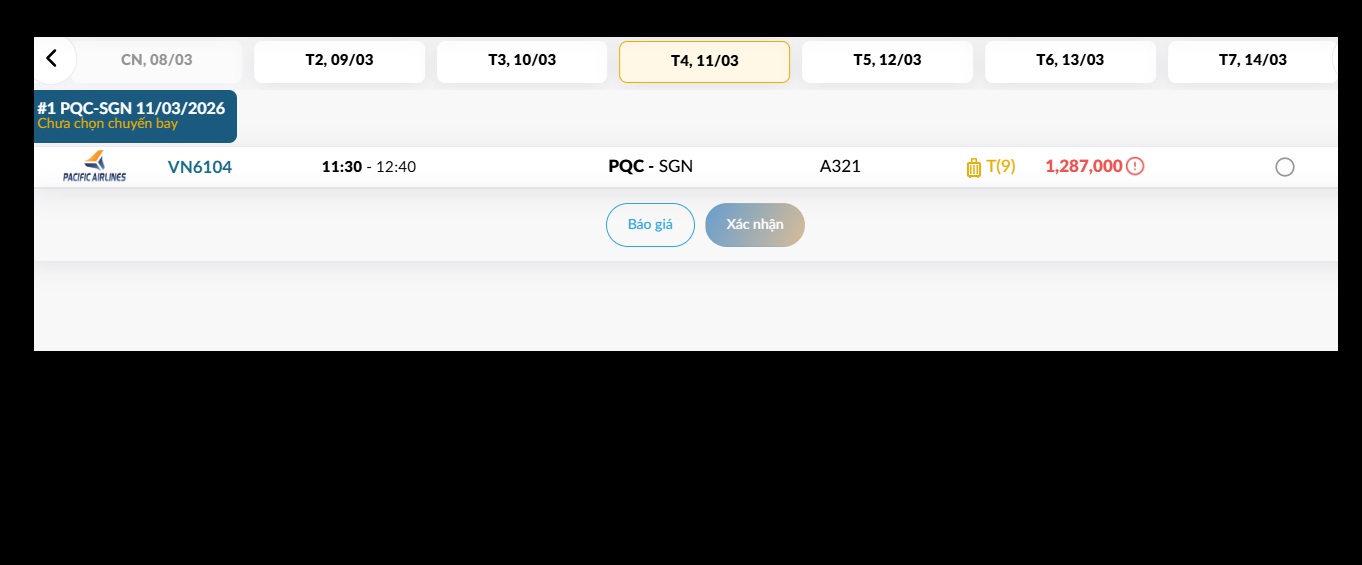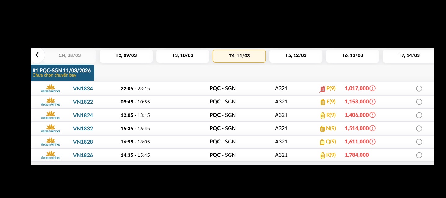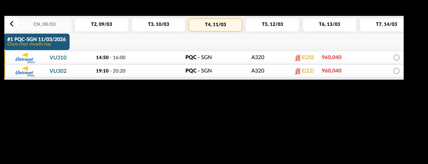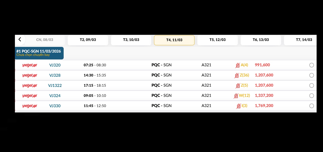 Phú Quốc (PQC) - TP. Hồ Chí Minh (SGN) Thứ tư 11/03/2026