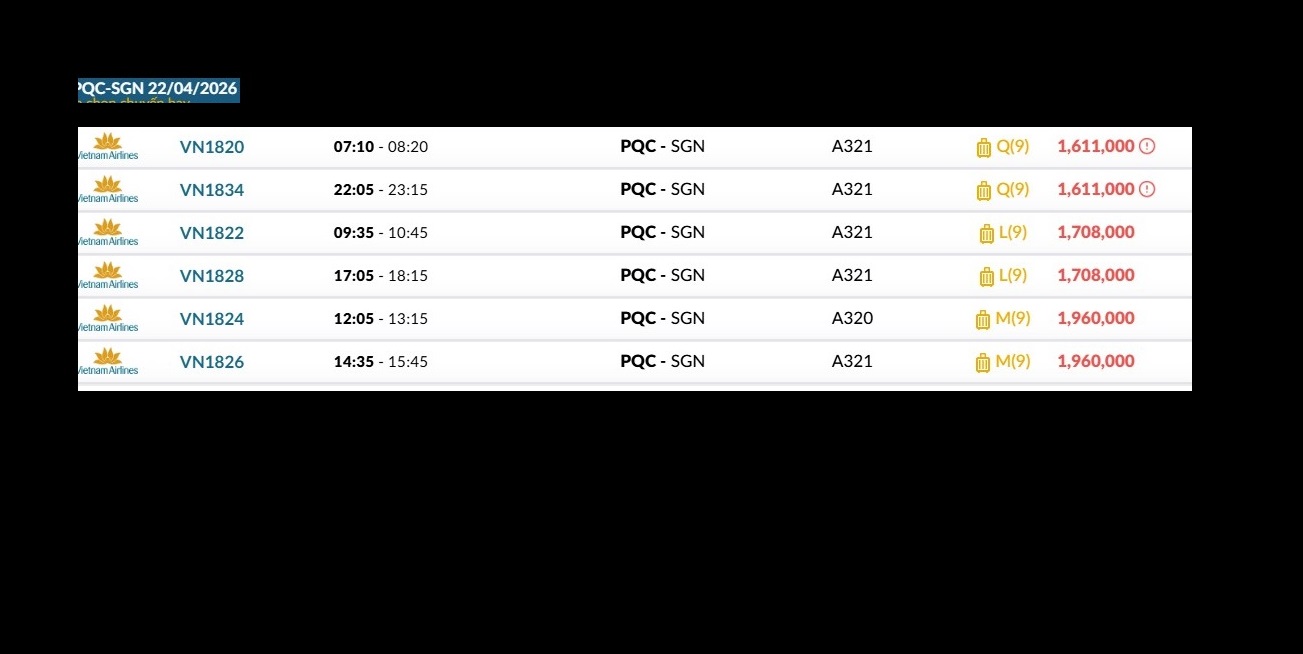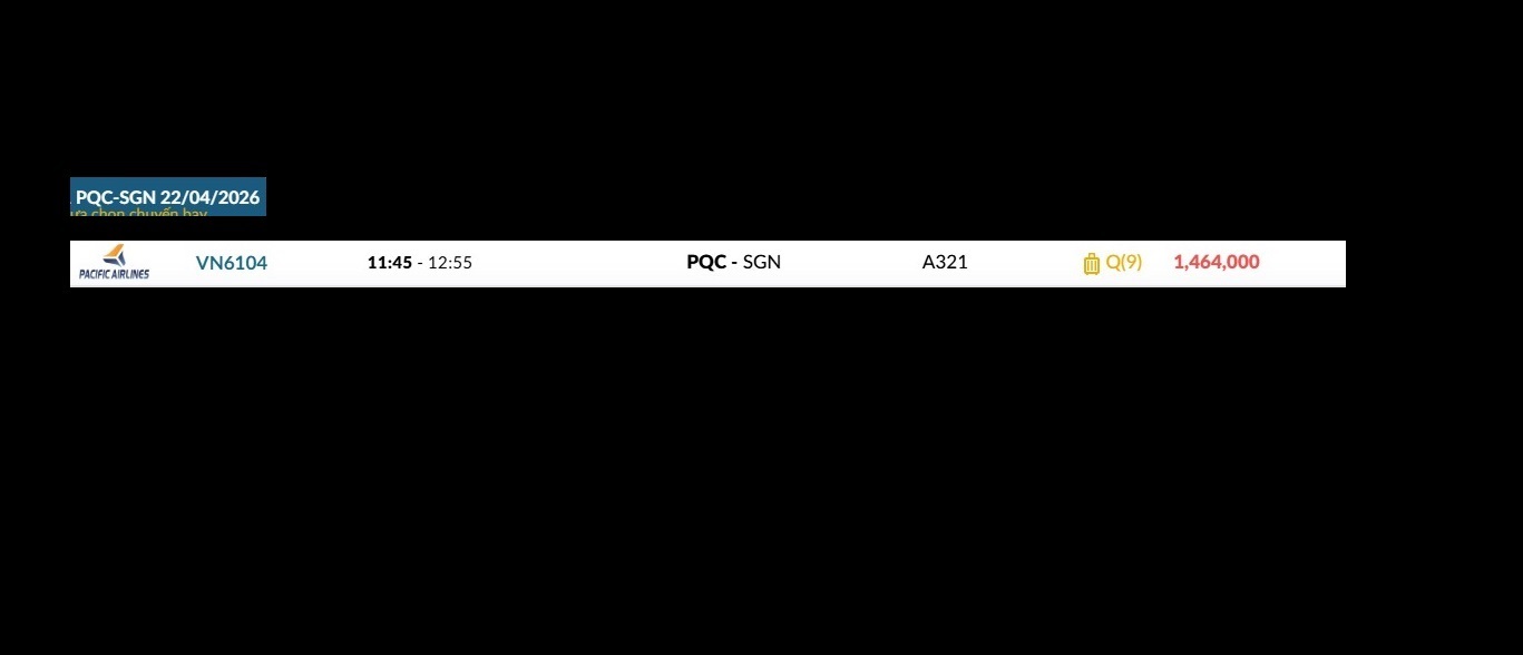 Phú Quốc (PQC) - TP. Hồ Chí Minh (SGN) Thứ tư 22/04/2026